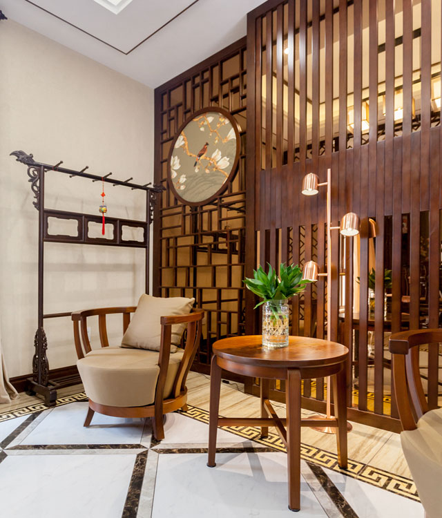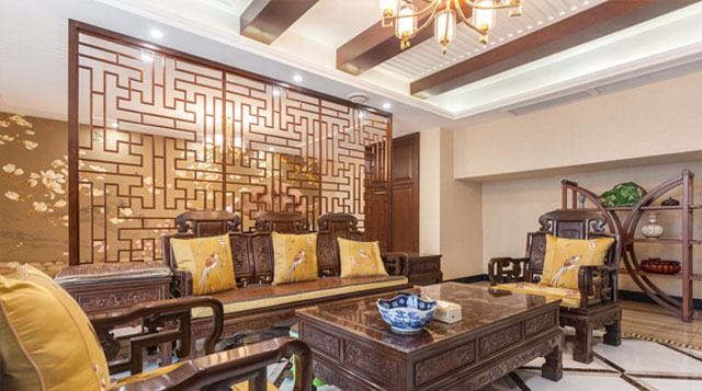 中式屏風做成的護墻與中式刺繡搭配
